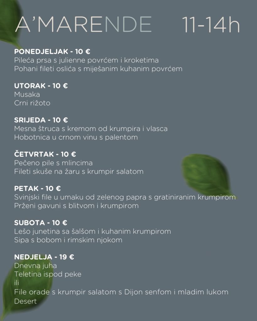 Svakim danom od 11 do 14 sati u restoranu A’mare, počastite se izvanrednim izborom jela koja odražavaju lokalne okuse i ljubav prema kuhinji, sve to za samo 10 eura.