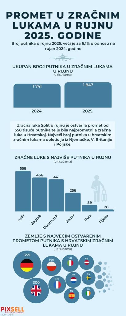 Kako pokazuje infografika PIXSELLa, u rujnu 2025. godine hrvatske zračne luke zabilježile su ukupno 1,847 milijuna putnika, što je porast od 6,1% u odnosu na rujan 2024., kada ih je bilo 1,741 milijun. Najprometnija je bila zračna luka Split s 558 tisuća putnika, slijede Zagreb (466 tisuća), Dubrovnik (441 tisuća), Zadar (256 tisuća), Pula (89 tisuća) i Rijeka (28 tisuća).