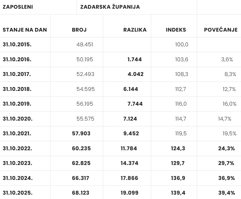 Prema podacima Hrvatskog zavoda za mirovinsko osiguranje, posljednjeg dana listopada u Zadarskoj županiji evidentirano je 68.123 zaposlenih, što predstavlja povećanje za gotovo dvije tisuće (2,7 posto) u odnosu na isti dan godinu ranije.