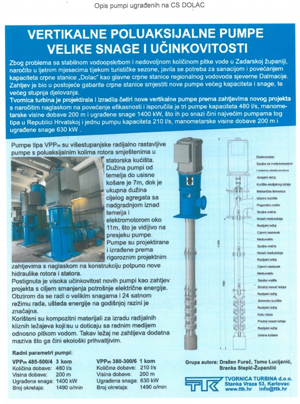 Tvornica turbina d.o.o. Karlovac je projektirala i izradila četiri nove vertikalne pumpe prema zahtjevima novog projekta s naročitim naglaskom na povećanje efikasnosti i isporučila je tri pumpe kapaciteta 480 l/s, manometarske visine dobave 200 m i ugrađene snage 1400 kW, što ih po snazi čini najvećim pumpama tog tipa u Republici Hrvatskoj i jednu pumpu kapaciteta 210 l/s, manometarske visine dobave 200 m i ugrađene snage 630 kW.