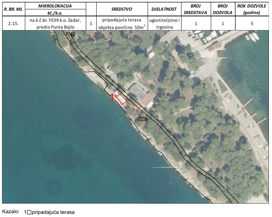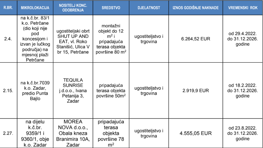 Osim ove dvije atraktivne terase, na administrativnom području Grada Zadra ostalo je još izdati dozvolu za kafić u Petrčanima na mjesnoj plaži – kiosk s pripadajućom terasom od 80 kvadrata. Referentna je početna cijena susjednog objekta, kioska s nešto manjom terasom od 60 kvadrata – 6.600 eura.