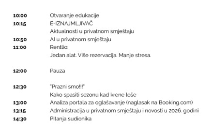 Poseban dio programa posvećen je izazovima u poslovanju, uključujući i temu „Prazni smo!!!“ – kako reagirati i spasiti sezonu kada potražnja krene slabije od očekivanog, kao i administrativnim obvezama i novostima koje iznajmljivače očekuju u 2026. godini. Nakon predavanja predviđeno je vrijeme za pitanja sudionika i otvorenu raspravu.
