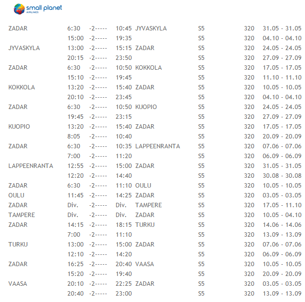 Nove charter linije organizira finska turistička agencija We Travel koja je pripremila novu ponudu paket aranžmana na zadarskom području. Nove charter letove će obavljati litavski zrakoplovni prijevoznik Small Planet Airlines zrakoplovima tipa Airbus A320, saznaje AeroCroatia .