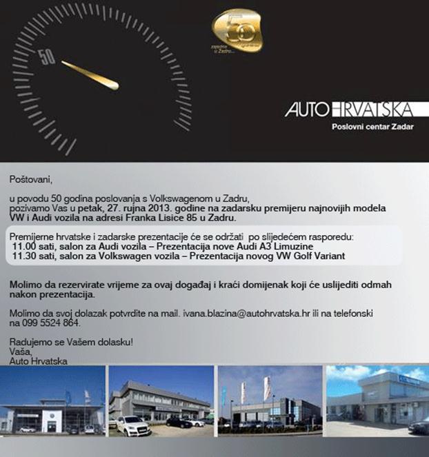 Auto Hrvatska, poslovni centar Zadar, u povodu 50 godina poslovanja s Volkswagenom u Zadru, poziva vas u petak, 27. rujna 2013. godine od 10 do 18 sati na promotivni dan na adresi Franka Lisice 85 u Zadru.