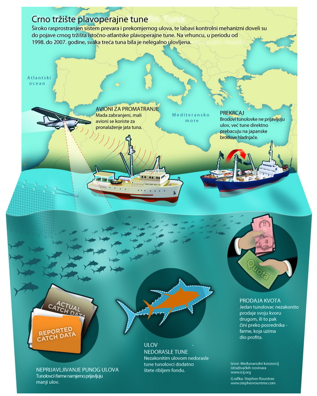 Sedmomjesečna istraga Međunarodnog konzorcija istraživačkih novinara (ICIJ) je pokazala da u pozadini munjevitog pada fonda plavoperajne tune stoje desetljeća nekontroliranog ulova i sveprisutnih prevara. Svake godine, tisuće tona tune je nelegalno izlovljavano i prodovano na tržištu. Na vrhuncu – između 1998. i 2007. godine – više od jedne trećine ulova bilo je nelegalno.