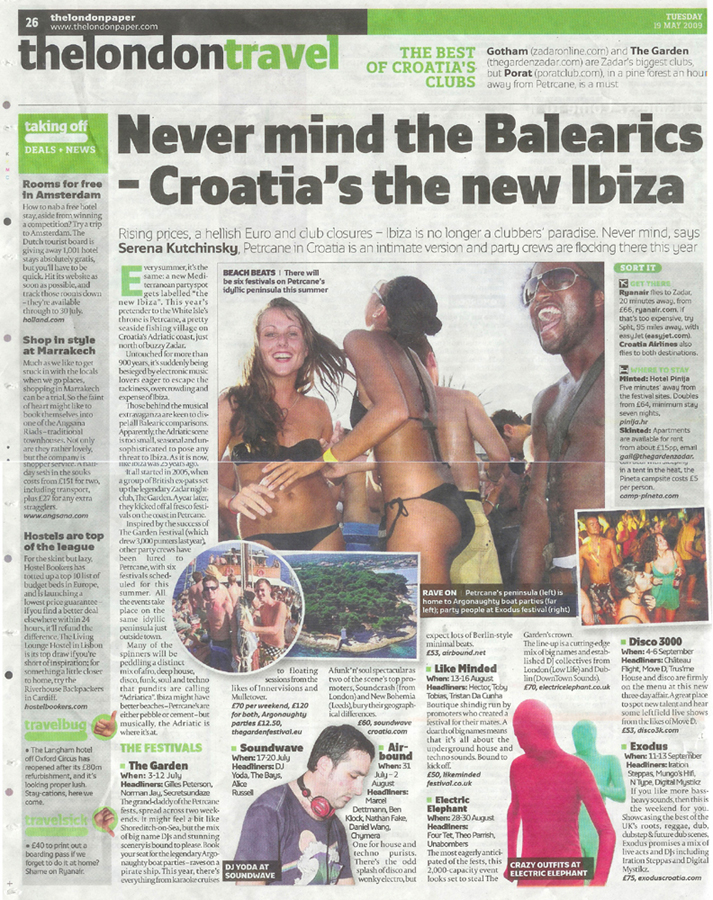 U članku pod naslovom “Never mind the Balearics – Croatia’s the new Ibiza” (Zaboravite Baleare – Hrvatska je nova Ibiza) novinarka Serena Kutchinsky navodi kako su porast cijena i “pakleni” Euro utjecali na zatvaranje klubova u Ibizi, koja se više ne može nazivati središtem klupske zabave. No, za Ibizom ne treba žaliti, jer su Petrčane kraj Zadra njezina intimnija verzija u koju će se ove godine zaputiti mnoštvo mladih Britanaca. Petrčane su malo jadransko mjesto nedaleko od Zadra, netaknuto tijekom 900 godina povijesti, gotovo se preko noći našlo pod opsadom tisuća ljubitelja elektronske glazbe. Sve je naravno započelo 2005. godine osnutkom već legendarnog zadarskog noćnog kluba The Garden i pokretanjem iznimno uspješnog The Garden Festivala, koji je samo prošle godine privukao oko 3.000 gostiju.
