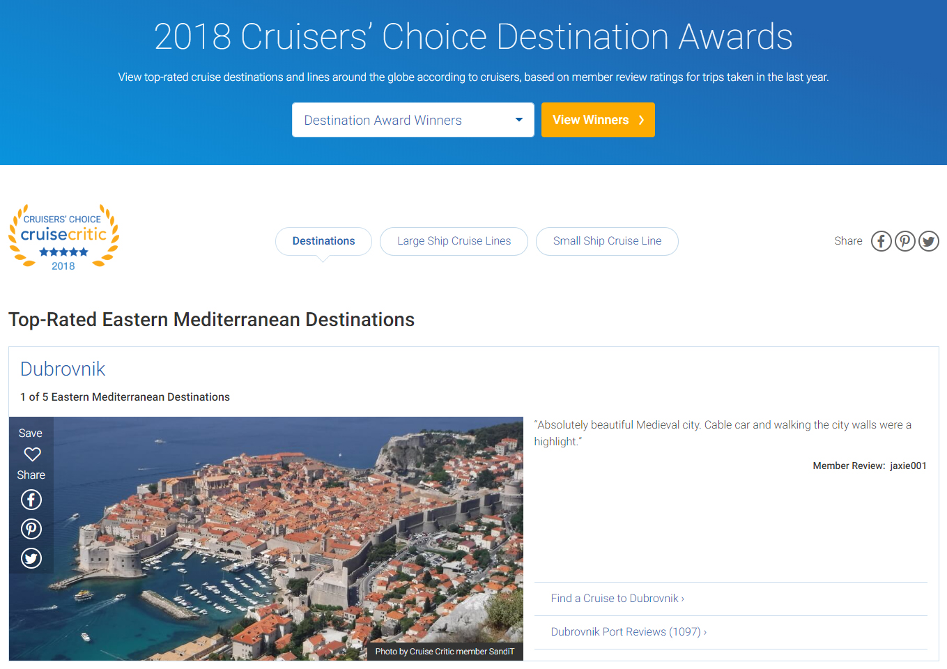 Prema izboru specijaliziranog portala za kruzing putovanja "Cruise Critic", Dubrovnik je drugu godinu zaredom proglašen najboljom kruzing destinacijom u kategoriji Istočni Mediteran.