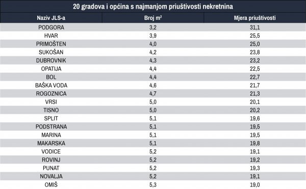 Primjerice, Podgora kod Makarske ima najviši izmjeren indeks priuštivosti, a slijede je Baška Voda, Bol, Dubrovnik, Hvar, Opatija, Primošten, Sukošan, Tisno, Rogoznica i Vrsi, u kojima je za kvadratni metar bilo potrebno u prosjeku izdvojiti 20 do 30 posto ostvarenog godišnjeg neto dohotka.