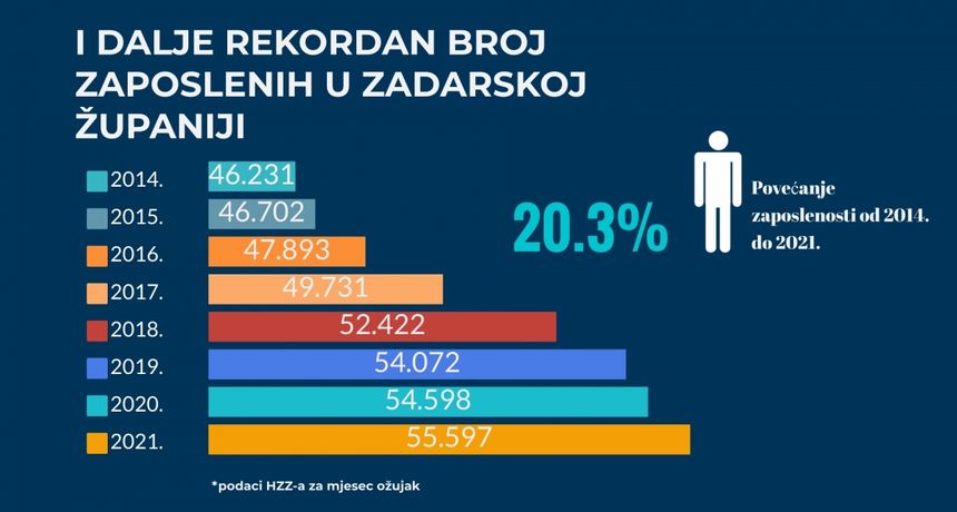 Zadarska županija unatoč korona krizi i na koncu trećeg mjeseca 2021. godine bilježi rekordan broj zaposlenih. Prema podacima Hrvatskog zavoda za zapošljavanje, posljednjeg dana ožujka u Zadarskoj županiji imali smo 55.597 zaposlenih, što je za 999 više nego na isti dan prošle godine.