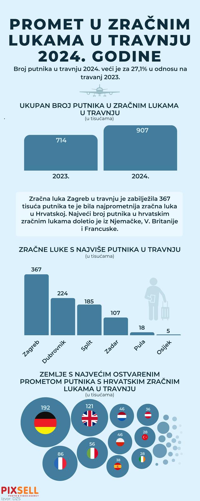 Zračna luka Zagreb u travnju je zabilježila 367.000 putnika te je bila najprometnija zračna luka u Hrvatskoj, dok je Zračna luka Zadar zabilježila 107 tisuća putnika i četvrta je u Hrvatskoj.