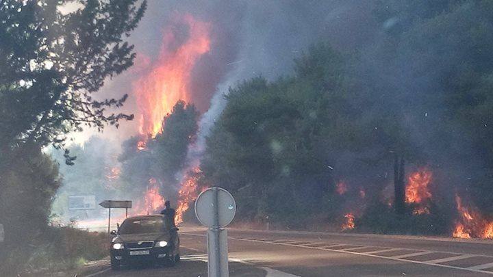 Veliki šumski požar buknuo je danas poslijepodne u blizini Crvene luke, između Biograda i Pakoštana s obje strane Jadranske magistrale (D8) u kojem je gorila gusta borova šuma.