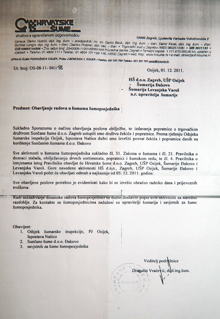 Rješenjem Šumarske inspekcije od 01.12.2011. godine, hitno je naloženo oduzimanje popratnica i vraćanje službenih čekića Hrvatskim šumama, koje su po zakonu jedine ovlaštene da u državnim i privatnim šumama obilježavaju tj. “čekićaju” stabla predviđena za sječu.