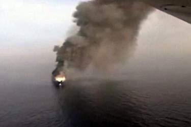 Krmeni dio broda je potpuno izgorio, dok pramčani dio broda i dalje gori.