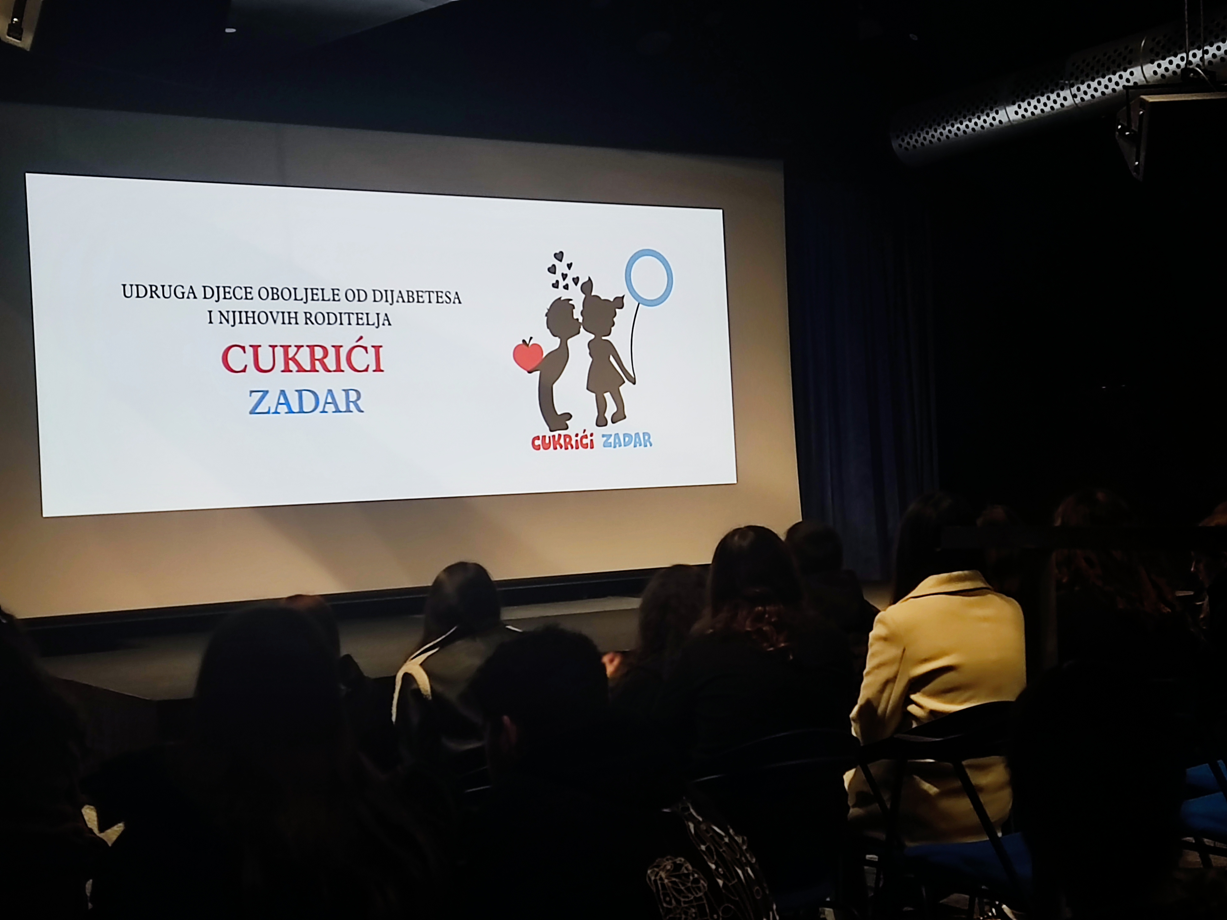 “Draga djeco, dragi odgojno obrazovni djelatnici danas vam donosimo priču o jednom posebnom filmu i još posebnijem dječaku. Film “Sigurno u dugi” prati život dječaka koji u svojoj drugoj godini saznaje da ima dijabetes. Zamislite dok su druga djeca bezbrižno uživala u igri, ovaj dječak, naučio je što znači imati bolest koja od njega traži puno hrabrosti, pažnje i brige. Njegova priča nije samo priča o izazovima, već i o snazi obitelji, prijatelja i svih ljudi koji su mu pružili ruku podrške.” – kazala je u emotivnom obraćanju, Doris Bajlo, predsjednica udruge “Cukrići” te dodala – “danas smo ovdje zahvaljujući Volonterskom centru Zadar te nevjerojatnim mladim volonterima uključenih u Mrežu školskih volonterskih klubova u svojim osnovnim i srednjim školama diljem županije. Vaša je pomoć i podrška neizmjerno važna. Kao Udruga Cukrići Zadar, želimo vam reći koliko smo ponosni na vas i koliko smo zahvalni. Vi ste dokaz da zajedništvo i mali koraci mogu učiniti čuda, Zato, kada se sjetite ovog filma, sjetite se i poruke koju nosi: uvijek pružite ruku onome kome je potrebna. Ponekad je upravo ta ruka most prema sigurnoj luci – dugi. Hvala vam od srca što ste pokazali kako dobrota nema granica. Vi ste naša inspiracija i nada za bolje sutra!.