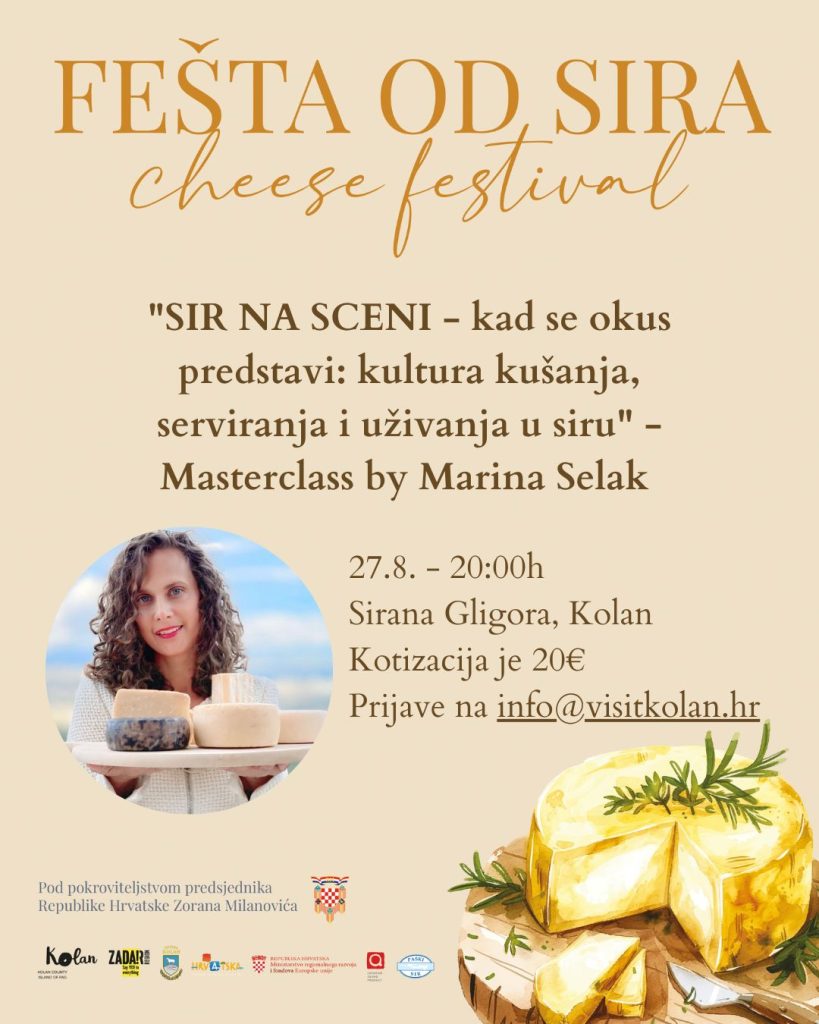 Najukusnija fešta na Pagu, tradicionalna Fešta od sira, uskoro ponovno okuplja ljubitelje sira, proizvođače i stručnjake u Kolanu. Ovogodišnje izdanje donosi bogat program, a posebnu pažnju privlači dolazak Michele Buster, renomirane američke stručnjakinje za sireve.