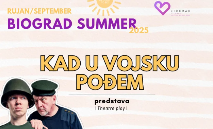 U sklopu rujanskog kulturnog programa, Turistička zajednica grada Biograd na Moru poziva sve građane i posjetitelje na kazališnu predstavu “Kad u vojsku pođem”, koja će se održati u srijedu, 10. rujna 2025. s početkom u 20:30 sati, na lokaciji Ljetno kino Biograd.