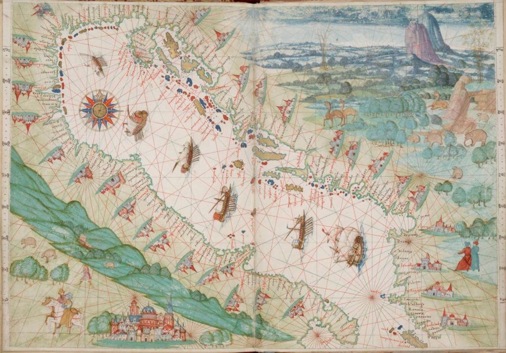 Pomorske karte tog vremena redovito su bile opremljene prepoznatljivim grafičkim elementima – kompasnim ružama i mrežom kompasnih crta (rumba) koje su tek od sredine 17. st. kartografi postupno zamjenjivali mrežom paralela i meridijana  s pripadajućim ljestvicama geografske širine i geografske dužine.