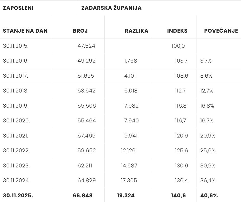 Ovaj pozitivan regionalni trend prati i slika na nacionalnoj razini. U cijeloj Republici Hrvatskoj na dan 30. studenoga 2025. zabilježeno je ukupno 1.741.486 osiguranika, što je porast od 2,3 % u odnosu na isto razdoblje 2024. godine. Zadarska županija svojim rezultatima ostaje jedan od najsnažnijih generatora tog nacionalnog rasta.