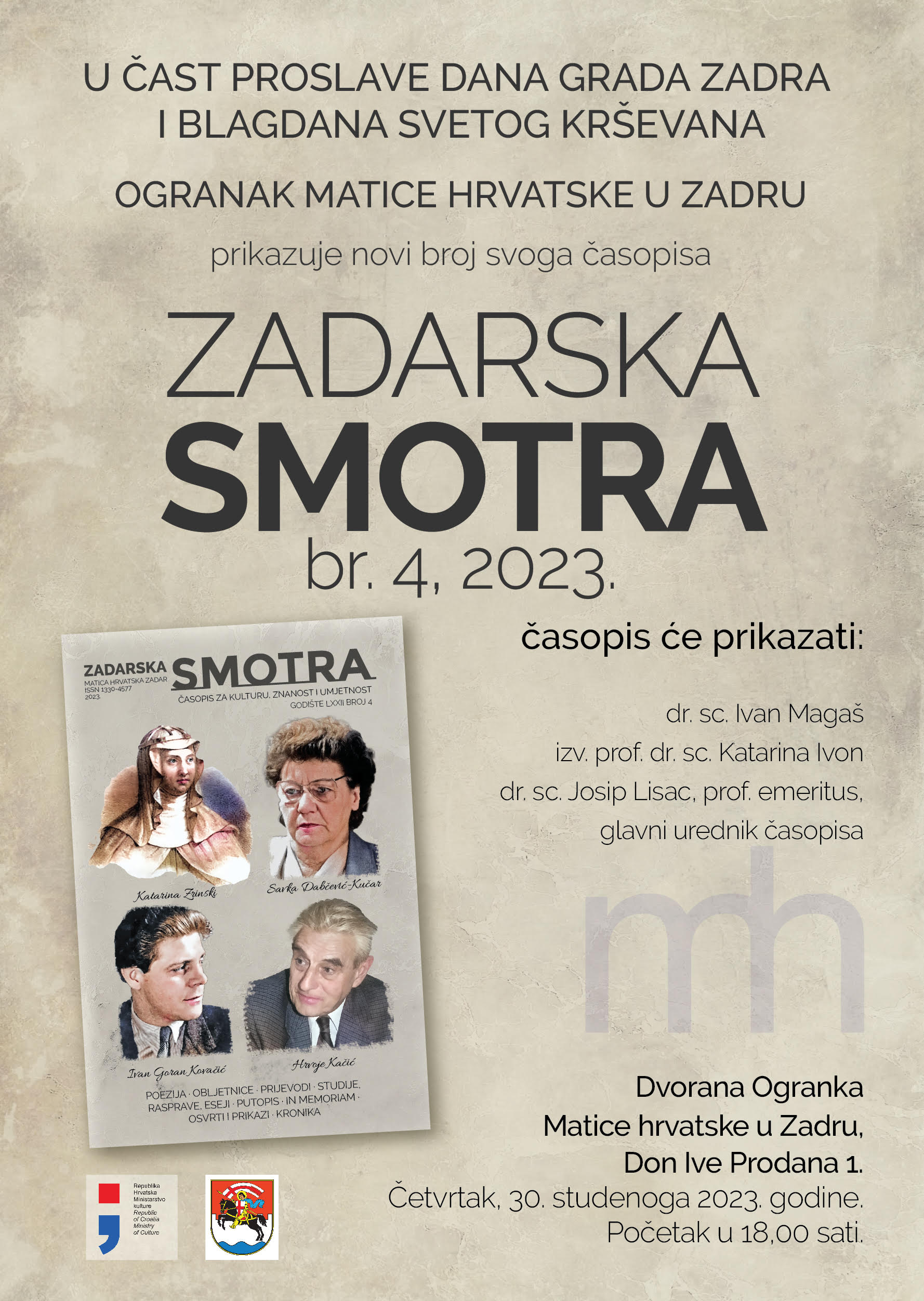Prikaz četvrtog ovogodišnjeg broja “Zadarske smotre” održat će se u četvrtak, 30. studenoga 2023. godine, u dvorani Ogranka Matice hrvatske u Zadru, Don Ive Prodana 1, s početkom u 18:00.