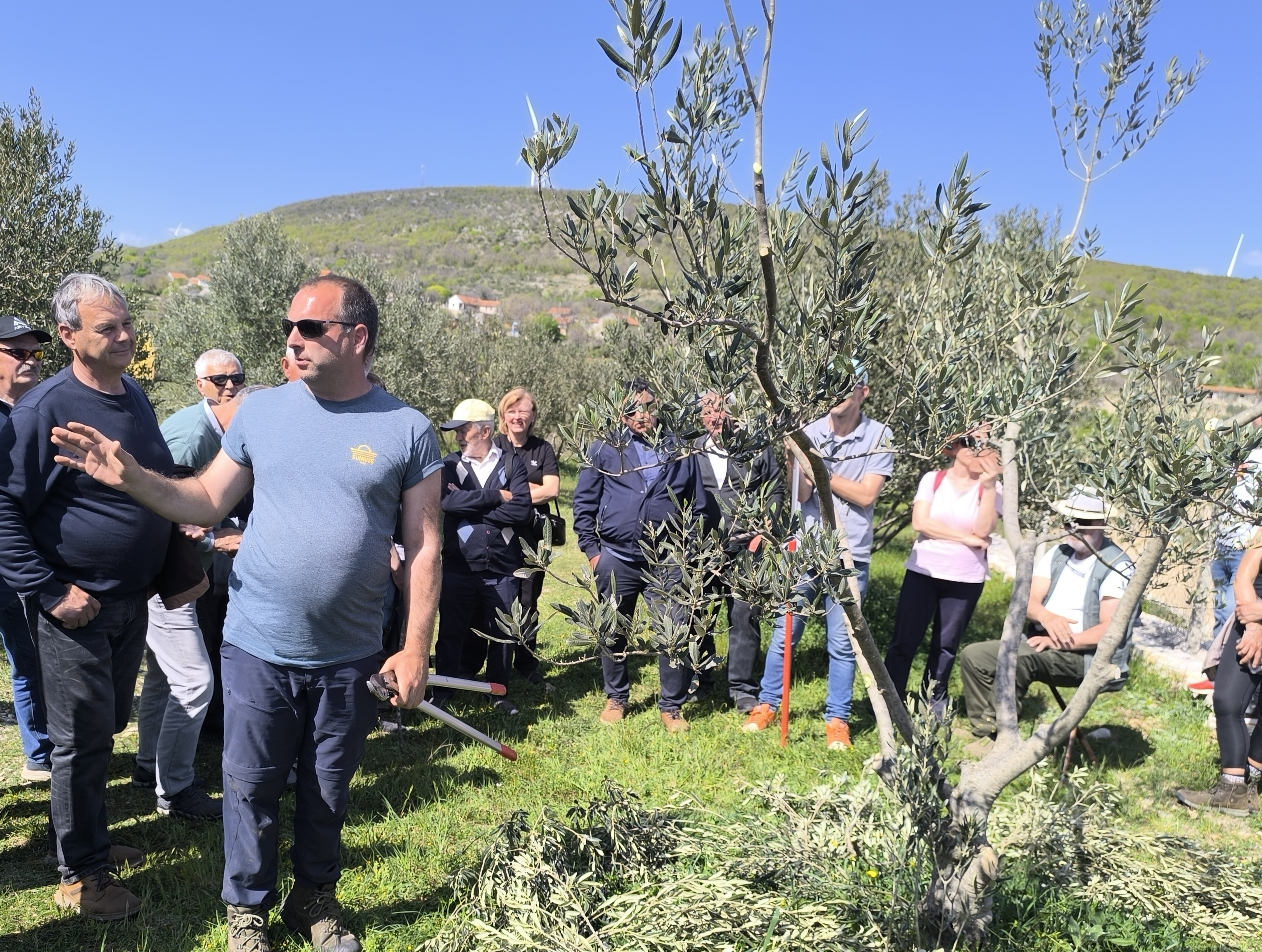 Rezidba maslina na uzgojni oblik polikonične vaze privlači sve veću pozornost. Kako se izvodi u masliniku OPG Nenad Zrilić u Bruškoj došli su vidjeti i članovi udruge Zagrebačkog maslinarskog instituta