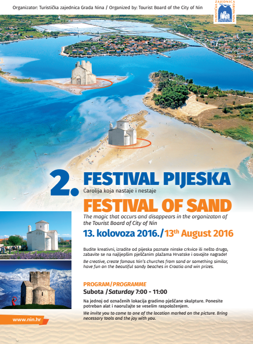 Prekrasne pješčane plaže obilježje su destinacije Nin, a obilje pijeska pruža nezaobilaznu inspiraciju na temu pijeska. Stoga se pozivaju zainteresirani sudionici da ponesu potreban alat, naoružaju se veselim raspoloženjem i sutra posjete Kraljičinu plažu i plažu Ždrijac te da budu dio čarolije koja nastaje i nestaje, zabavljaju se, grade skulpture od pijeska i osvoje nagrade.