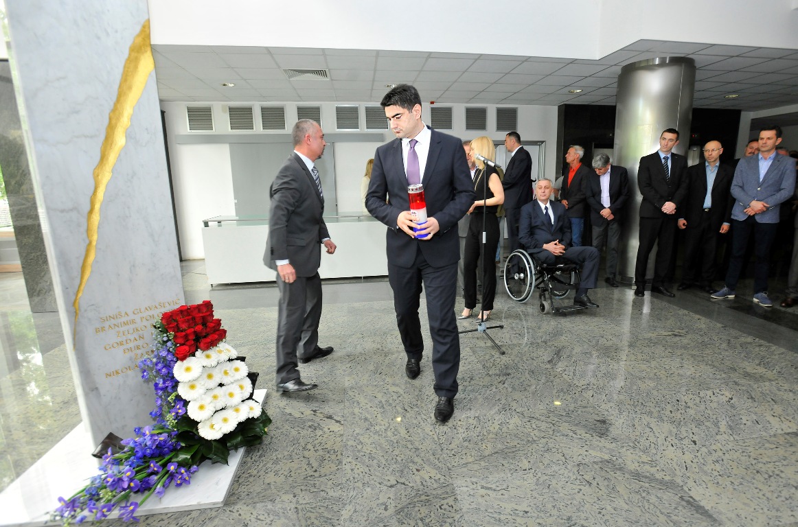 “Velika mi je čast što smo svi danas ovdje i što smo zajedno položili vijence na spomen-obilježje našim kolegama koji su poginuli u Domovinskome ratu radeći samo svoj posao. Želim ih još jednom sve spomenuti – to su Žarko Kaić, Gordan Lederer, Đuro Podboj, Nikola Stojanac, Željko Ružičić, Branimir Polovina i Siniša Glavašević. Nema dovoljno pravih riječi kojima bih naglasio koliko im dugujemo i koliko su učinili za svoju domovinu. Nema ni dovoljno pravih riječi kojima bih obiteljima još jednom rekao koliko nam je žao zbog njihovagubitka, ali i našega”, izjavio je vršitelj dužnosti glavnoga ravnatelja Hrvatska radiotelevizije Siniša Kovačić.