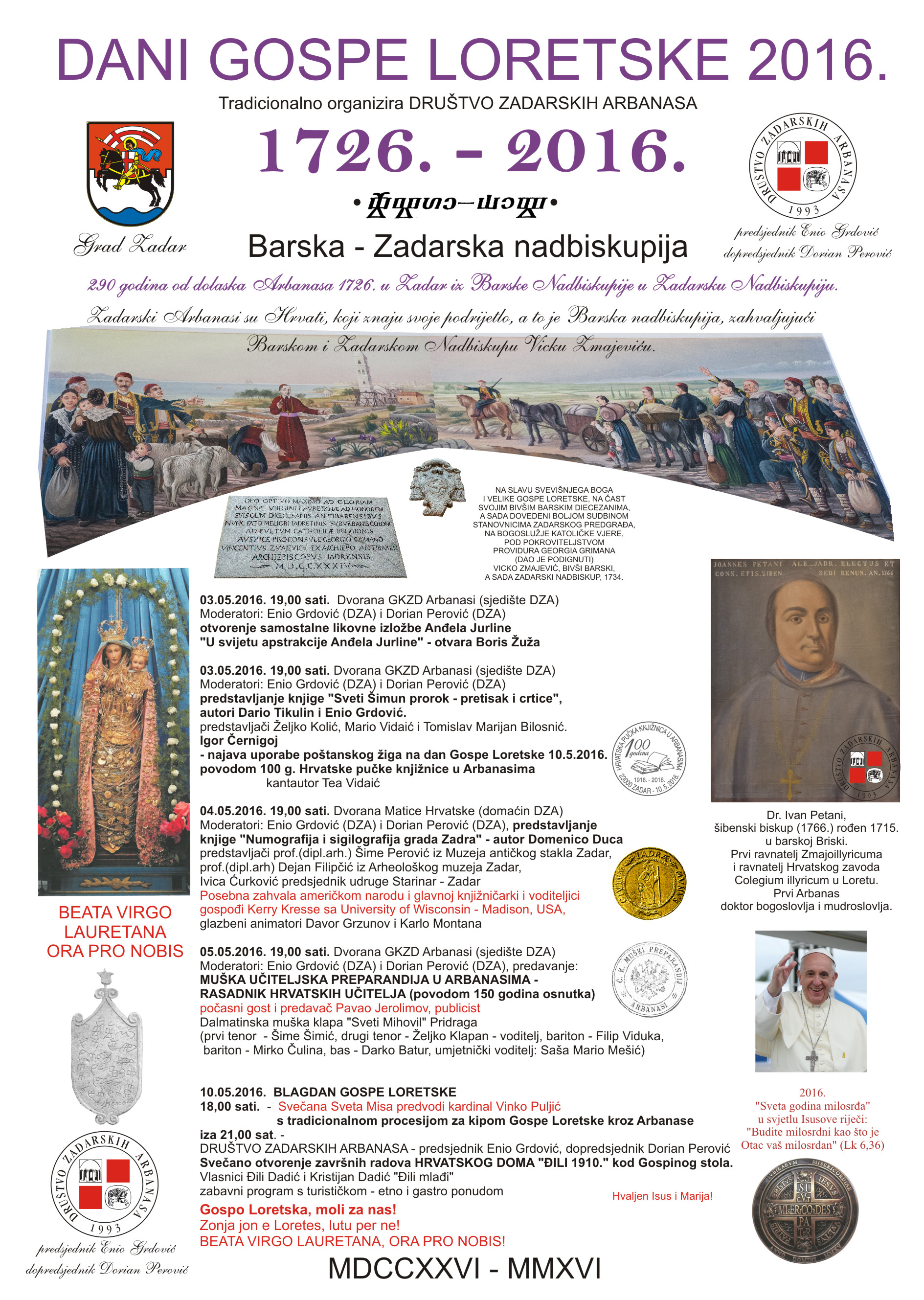 Ove godine je posebno naglasak na 290.godina od dolaska Arbanasa 1726.g. iz Barske Nadbiskupije u Zadarsku Nadbiskupiju, a Zadarski Arbanasi su hrvati zahvaljujući Nadbiskupu Vicku Zmajeviću.