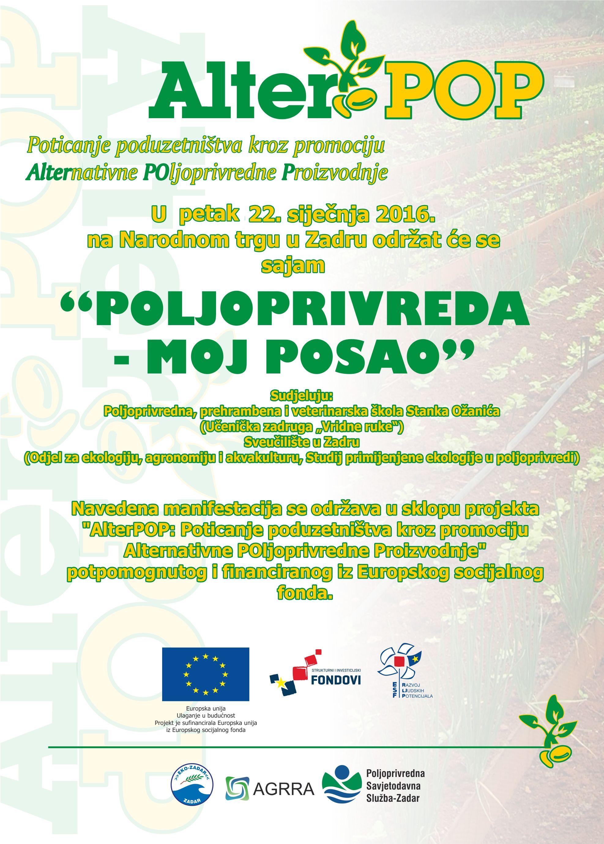 Manifestacija se održava u sklopu projekta “AlterPOP: Poticanje poduzetništva kroz promociju Alternativne POljoprivredne Proizvodnje” potpomognutu i financiranu iz Europskog socijalnog fonda.