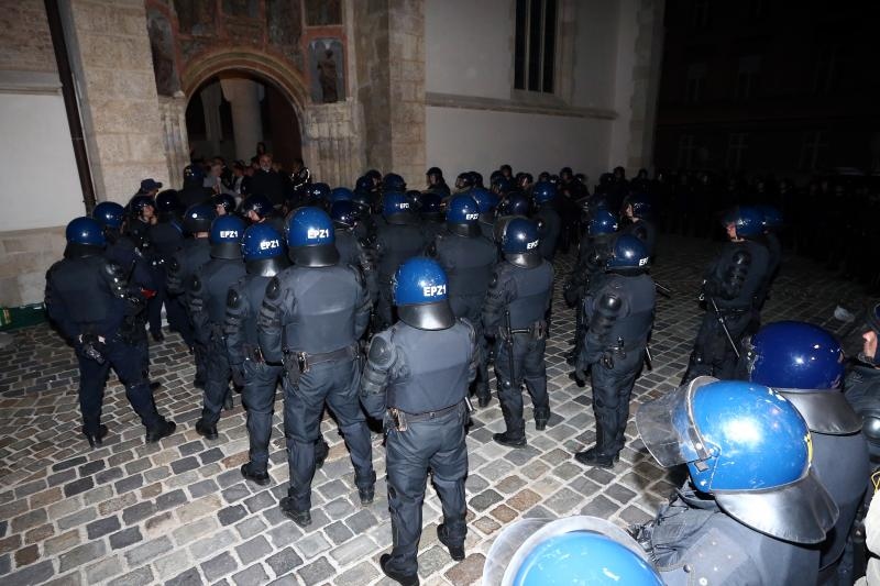 Interventna policija upozorila je megafonom okupljene branitelje koji su na ulazu u crkvu sv. Marka molili “Oče naš” da se raziđu te da im je to zadnje upozorenje prije intervencije.