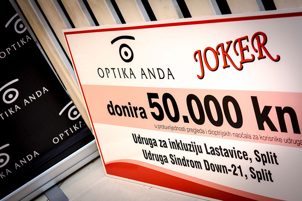 Optika Anda u suradnji sa partnerom Joker centrom je za ove blagdane donirala ček u protuvrijednosti od 50 tisuća kuna Udruzi za inkluziju Lastavice, Split i Udruzi Sindrom Down-21, Split.