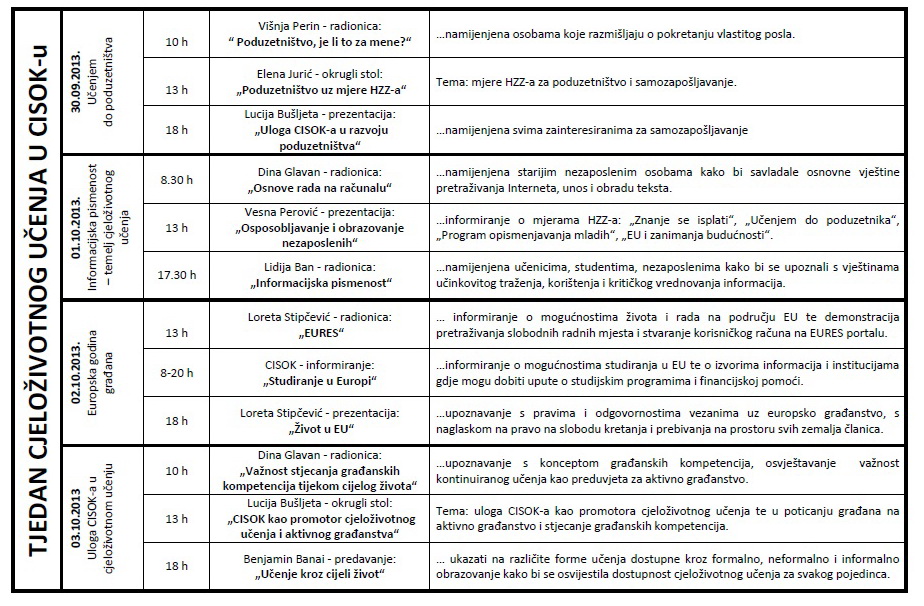 CISOK poziva sve zainteresirane da detalje o aktivnostima pogledaju na http://cisok.hr/aktivnosti-u-centrima te za prijave i upite kontaktiraju na e-mail: cisok-zadar@hzz.hr ili broj telefona 023/311-949.