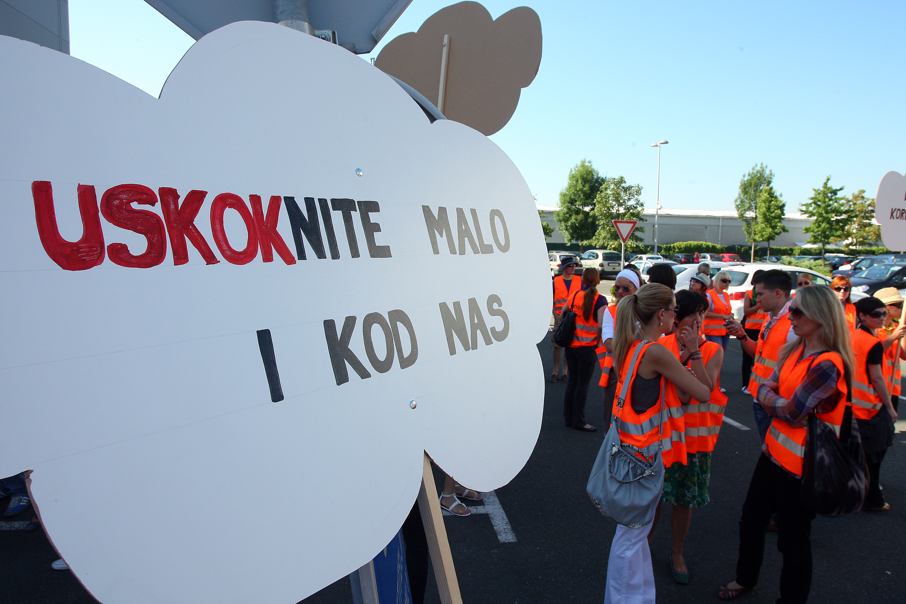 Članovi i članice Sindikata i dalje su pred upravnom zgradom kompanije u Buzinu, obučeni u narančaste prsluke i s natpisima kao "USKOKnite malo i do nas"