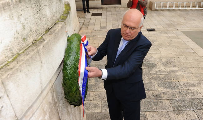 U povodu 65. obljetnice pobjede nad fašizmom, predstavnici Grada Zadra, gradonačelnik Zvonimir Vrančić, dogradonačelnici Darko Kasap i Dražen Grgurević te predsjednik Gradskog vijeća Živko Kolega, jutros su na spomen obilježje na Narodnom trgu položili vijenac.