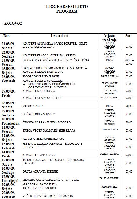 U kolovozu izdvajamo veliku turističku feštu Biogradsku noć 4. kolovoza, koncerte Mate Bulića te klape Sv. Juraj 7. kolovoza, koncert Duška Lokina i Emily 9. kolovoza, te mnoštvo predstava, izložbi i koncerata ozbiljne glazbe.