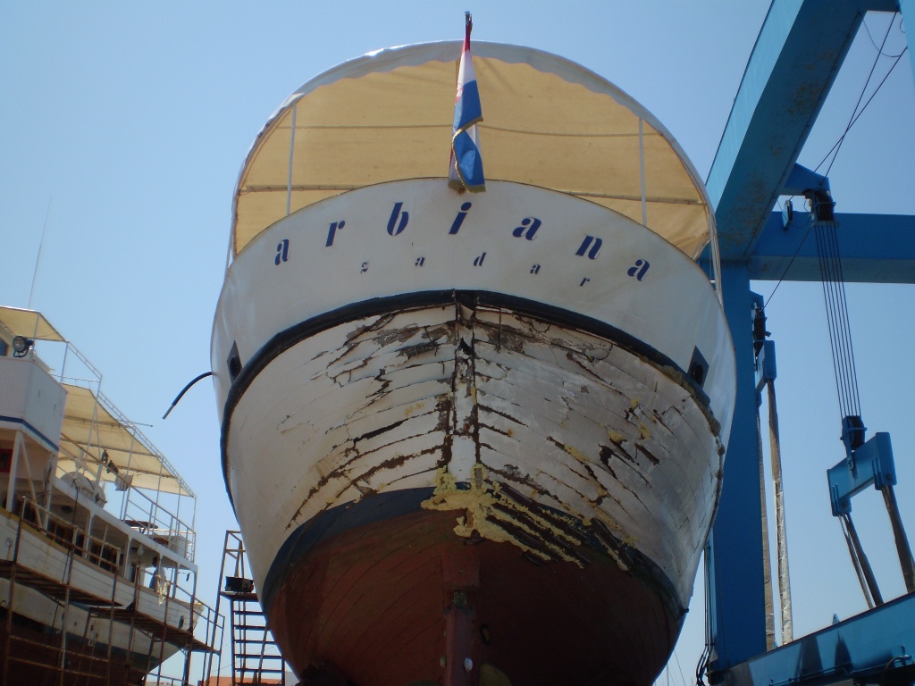 Izletnički brod Arbiana koji je 24. lipnja krmom udario u rivu u Preku te pretrpio znatna oštećenja jučer je remorkerom dovučen u betinsko brodogradilište. Arbiana je danas dizalicom podignuta na kopno, a uskoro bi trebala biti odvučena u hangar na procjenu štete i popravke.