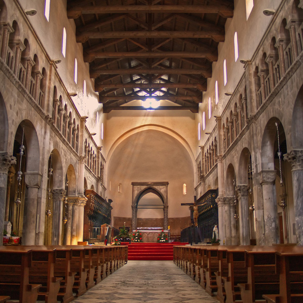 Posebne ljepote i vrijednosti njezine su galerije, korske klupe, kao i rekonstruirana ranokršćanska krstionica iz 5. st. stradala u II. svjetskom ratu.