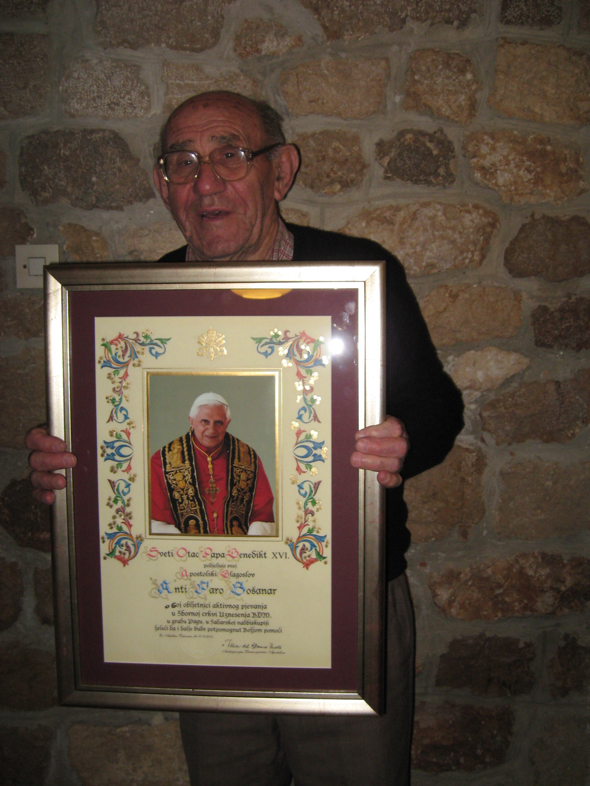 Osamdesetšestogodišnji Ante Paro Bošanar, najstariji pjevač u zboru Blažene Djevice Marije iz Paga, dobio je najljepši novogodišnji dar, apostolski blagoslov pape Benedikta XVI. kojeg mu je na prigodnoj svečanosti uručio paški nadžupnik don Srećko Frka Petešić.
