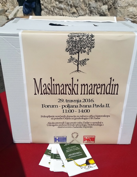 Za konzumirana jela i pića tijekom Maslinarskog marendina na Forumu 28. travnja, posjetitelji će dobrovoljnim prilozima podržati djelovanje Lige protiv raka i Onkološkog odsjeka Opće bolnice Zadar za nabavku uređaja za zračenje.