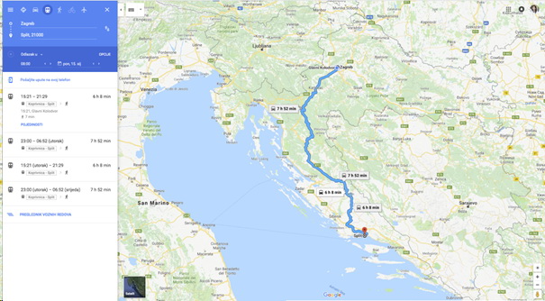 Kako biste pristupili informacijama o prijevozu, posjetite stranicu maps.google.hr, kliknite “Upute” i unesite polazište i odredište upisivanjem adrese ili naziva mjesta. Nakon toga odaberite ikonu koja označava vrstu prijevoza, smjer kretanja, vozni red i ostale podatke koji možete jednostavno pretraživati. Google Maps će vam predložiti nekoliko opcija od kojih odaberite onu koja vam najbolje odgovara.