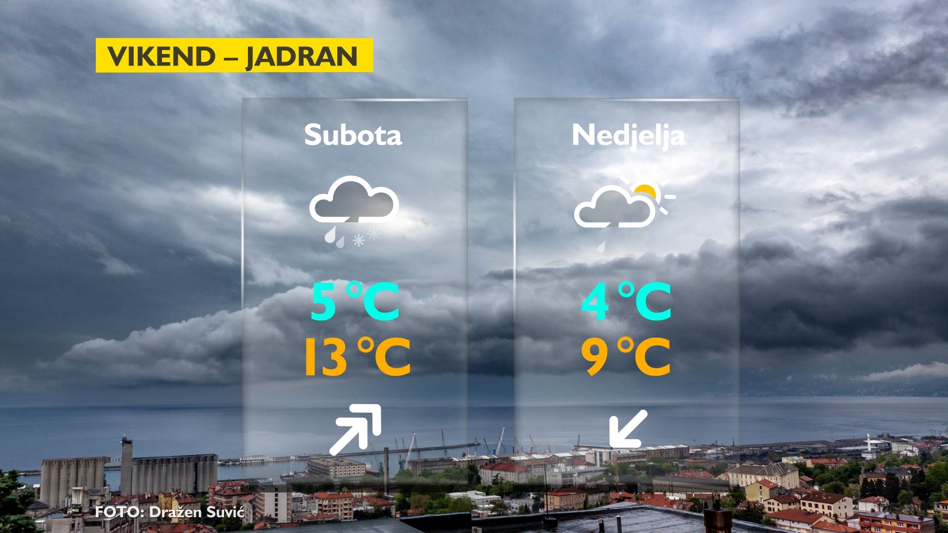 Na sjevernom Jadranu kiša već pada i to prilično jako, nastavit će i do kraja dana, a povremeno se očekuje i u dijelu Dalmacije, najčešće u srednjoj i južnoj. Pratit će je umjereno i jako jugo i oštro, a olujni udari vjetra dizat će valove preko 2,5 metra na otvorenom moru južnoga Jadrana. Već sredinom dana bura će se dignuti u sjevernoj Istri, u rano popodne i na riječkom području, a navečer na cijelom Kvarneru. S burom, u noći na subotu će snijeg stići i do Hrvatskog primorja, a pokoji centimetar mogao bi tijekom subote zabijeliti i Krk i dio Cresa, čak i Lošinj. Drugdje će padati kiša, u prvom dijelu subote prilično snažna i obilna. S juga će polako okretati na lebićadu i pulenat. U nedjelju razvedravanje, puhat će većinom slaba do umjerena bura i tramontana, a temperatura će biti primjerena dobu godine.