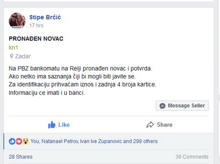 Stipe je u Facebook grupi Buvljak online-Zadar napisao da je na jednom zadarskom bankomatu na Relji pronašao našao novac i potvrdu te objasnio kako će vlasnik doći do njih.