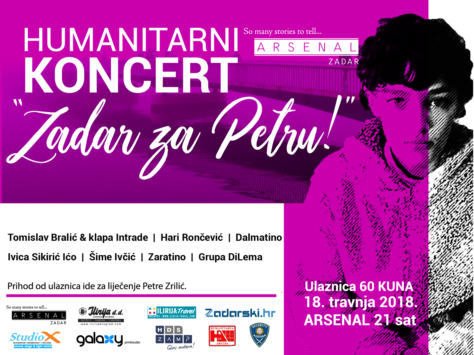 Koncert “Zadar za Petru” će se održat će se u srijedu, 18. travnja s početkom u 21 sat u Arsenalu, a njemu će nastupiti Tomislav Bralić & Klapa Intrade, Hari Rončević, Dalmatino, Ivica Sikirić Ićo, Šime Ivčić, Zaratino, grupa DILema i mnogi drugi.