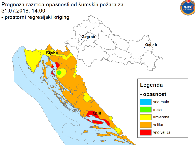 Državna uprava za zaštitu i spašavanje Republike Hrvatske izdala je prognozu razreda opasnosti od šumskih požara za današnji dan.