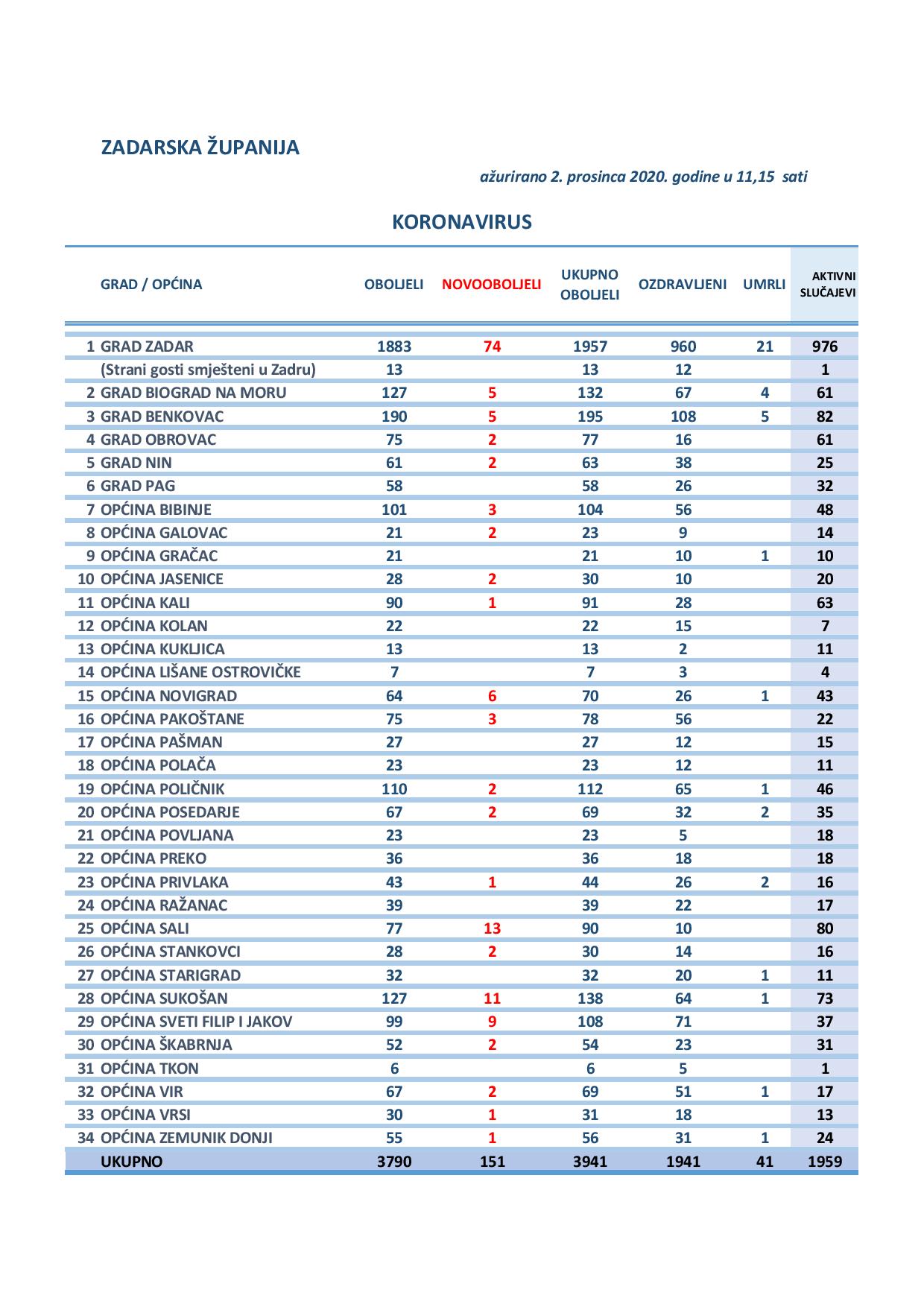 Novooboljele osobe izolaciju provode na područjima gradova Zadar (74), Benkovac(5), Biograd na Moru(5), Nin(2) i Obrovac(2) te općina Bibinje(3), Galovac(2), jasenice(2), Novigrad(6), Pakoštane(3), Poličnik(2), Posedarje(1), Privlaka(1), Sali(13), Stankovci(2), Sukošan (11), Sv.Filip i Jakov(9), Škabrnja(2), Vir(2), Vrsi(1) i Zemunik Donji (1)