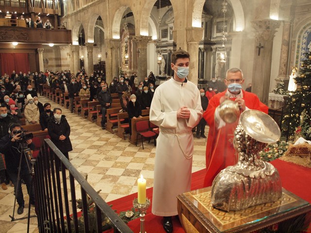 Sv. Stošija zbog vjernosti Kristu i pomaganju kršćana u Rimskom carstvu podnijela je mučeničku smrt na Božić 304. g. u Srijemskoj Mitrovici za vrijeme Dioklecijanovih progona. Na početku mise nadbiskup i svećenici počastili su moći sv. Stošije koje se od 810. g. nalaze u mramornom sarkofagu u pokrajnjoj lađi zadarske katedrale koja od tada i nosi ime sv. Stošije, rođenjem Rimljanke, mučeništvom Srijemkinje a štovanjem Zadranke. Časti se i na Istoku gdje su mnoge pravoslavne crkve posvećene sv. Anastaziji, odnosno Stošiji. Njene relikvije su bile dar zadarskom biskupu Donatu jer je u 9. st. doprinio postizanju mira između Istoka i Zapada.