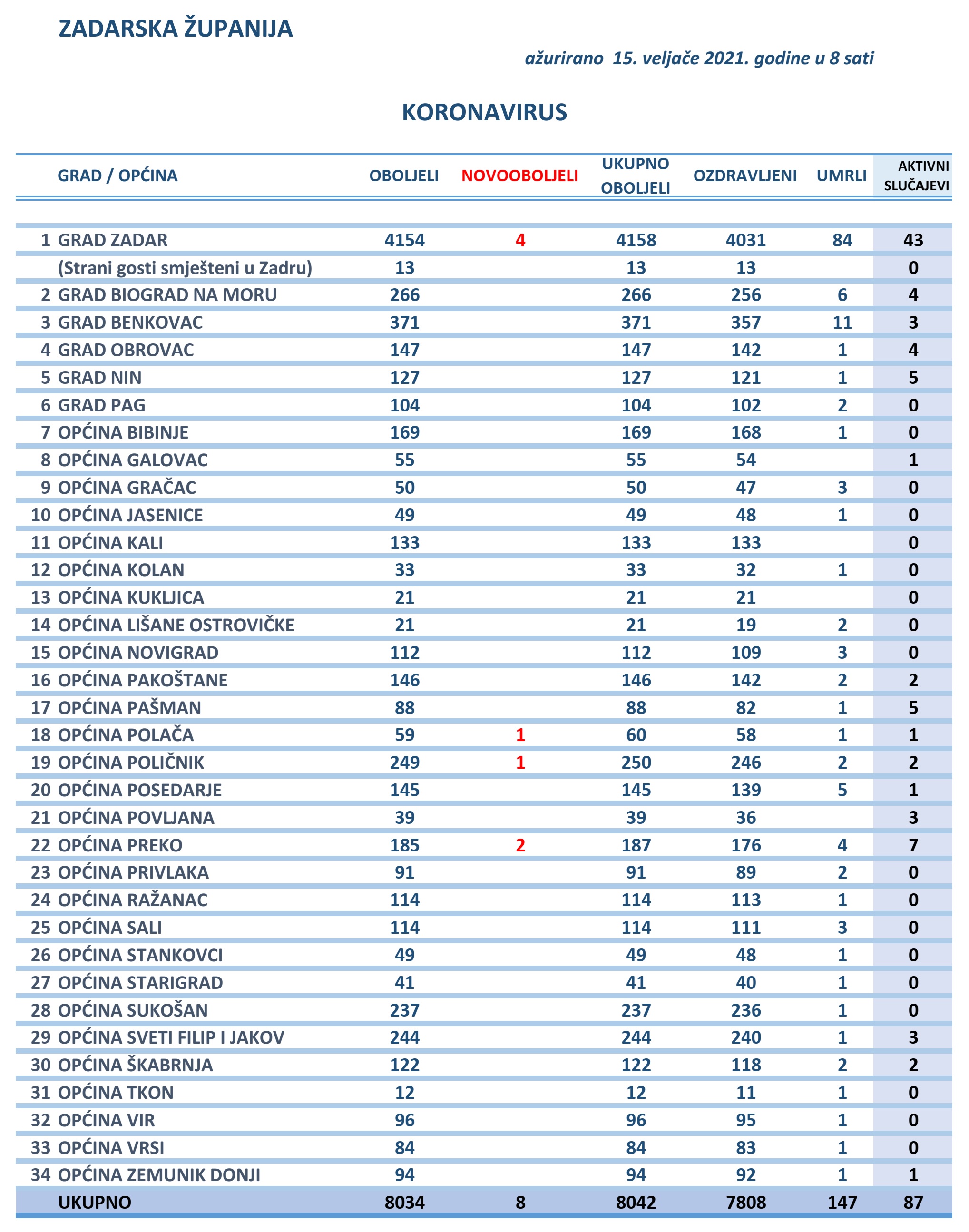 4 novooboljele osobe izolaciju provode na području Grada Zadra, dvije na području Općine Preko te po jedna na području Poličnika i Posedarja.