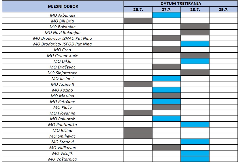 Adulticidna dezinsekcija komaraca ULV metodom na području Grada Zadra provoditi će se od 26.07.2021. do 29.07.2021. godine prema priloženoj dinamici.