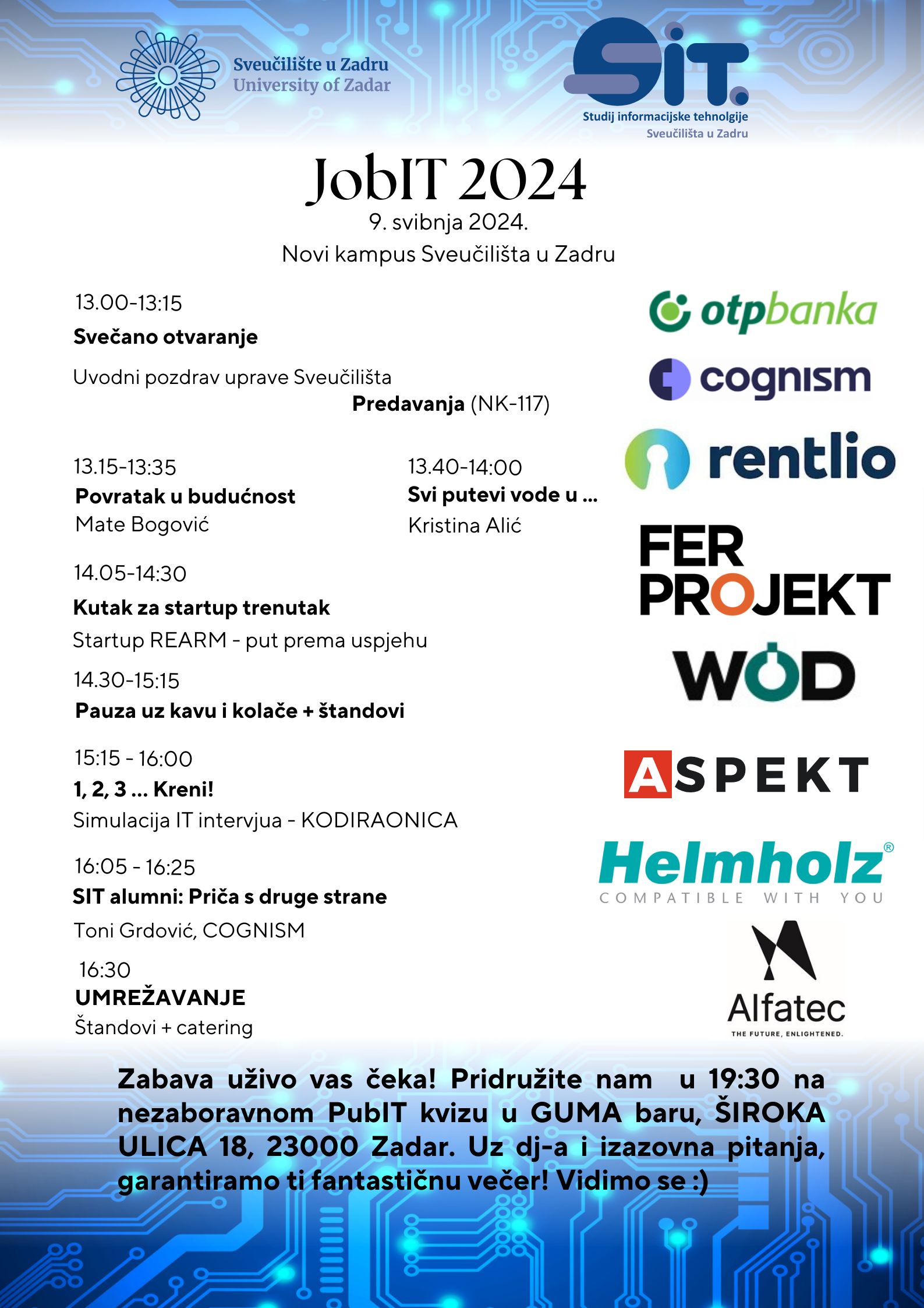 Sa Sveučilišta u Zadru pozivaju na na JobIT 2024, koji će se održati 9. svibnja 2024. na Novom kampusu Sveučilišta u Zadru.