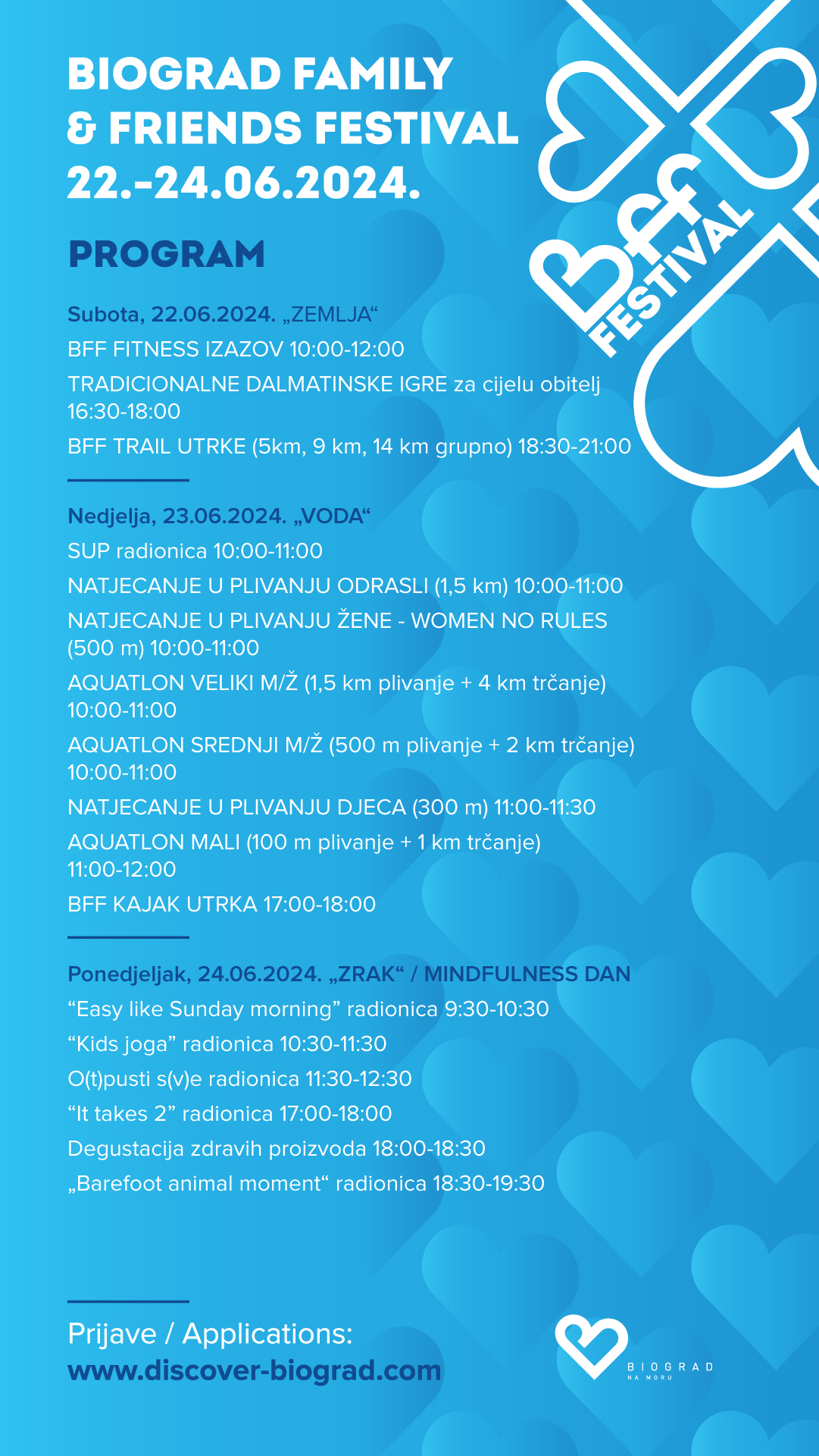 Sudjelovati možete na BFF Trailu 5, 9 i 14 km (individualno ili u paru), BFF natjecanju u kajacima, BFF fitness izazovu, BFF aquatlonu za djecu i odrasle, BFF natjecanju u plivanju, a u ponedjeljak, 24. lipnja vas očekuje mindfulness dan – za vaš um i tijelo.