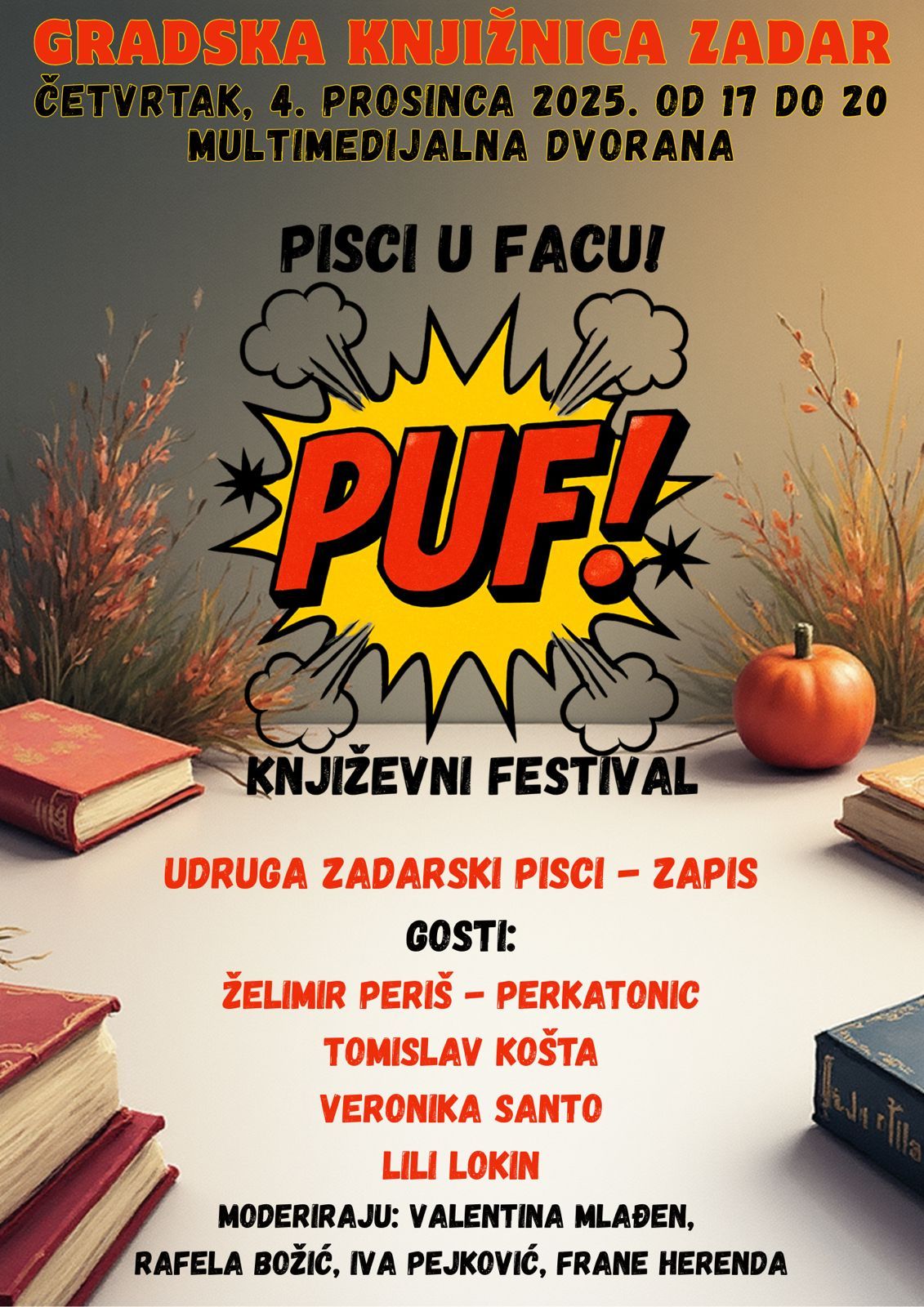 Gradska knjižnica Zadar 4. prosinca 2025. pretvorit će se u središte književnih susreta, dijaloga i kreativne razmjene kada udruga zadarskih pisaca ZaPis organizira novo izdanje književnog festivala PUF! – Pisci u facu pod motom Književnost bez filtera uz iskrene razgovore i sjajne goste. Festival će se održati u Multimedijalnoj dvorani od 17 do 20 sati, […]